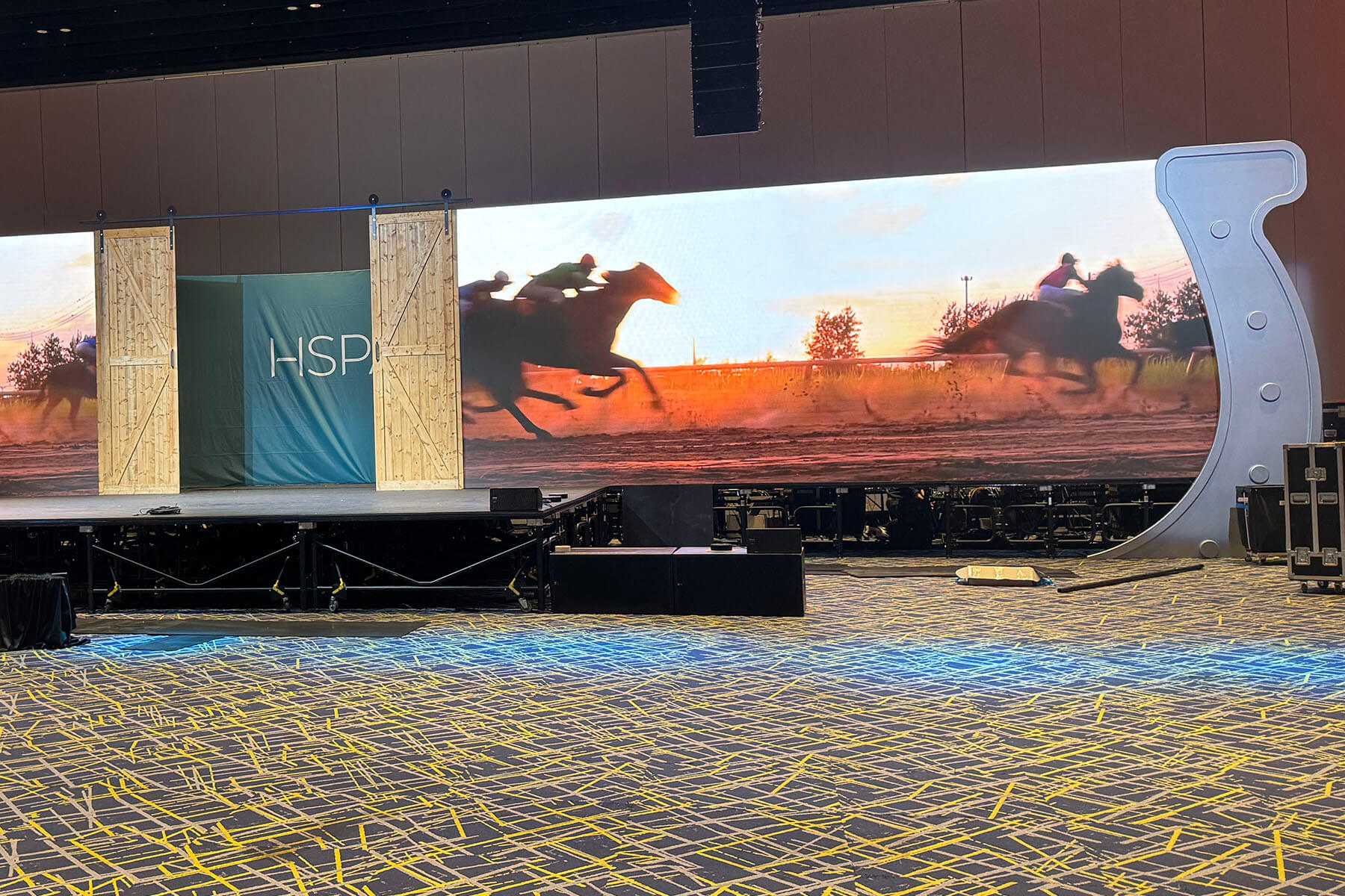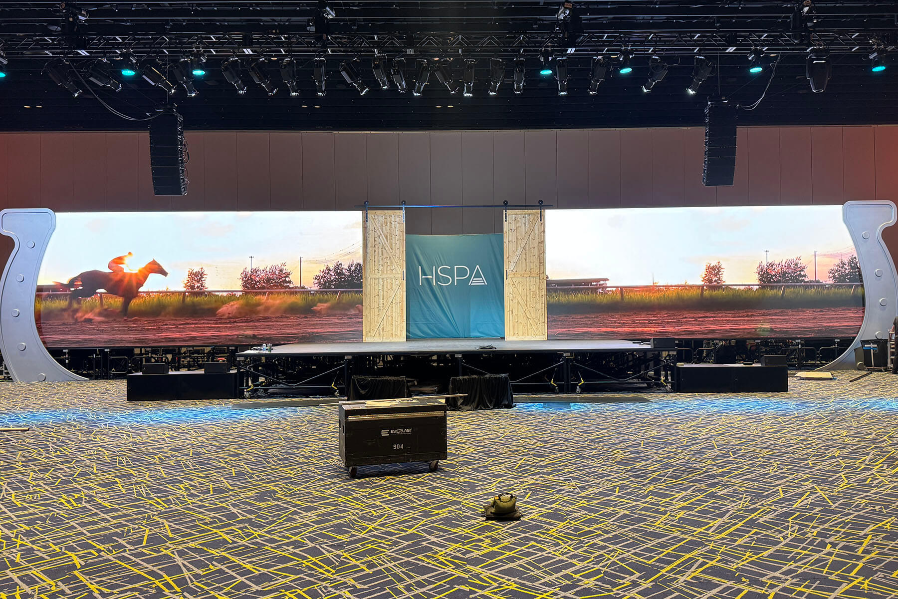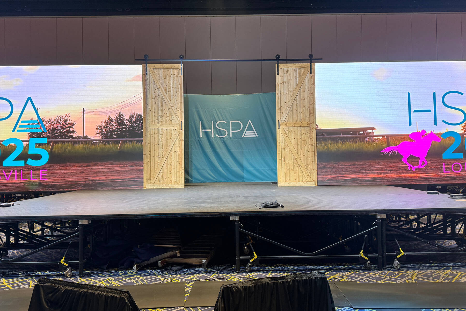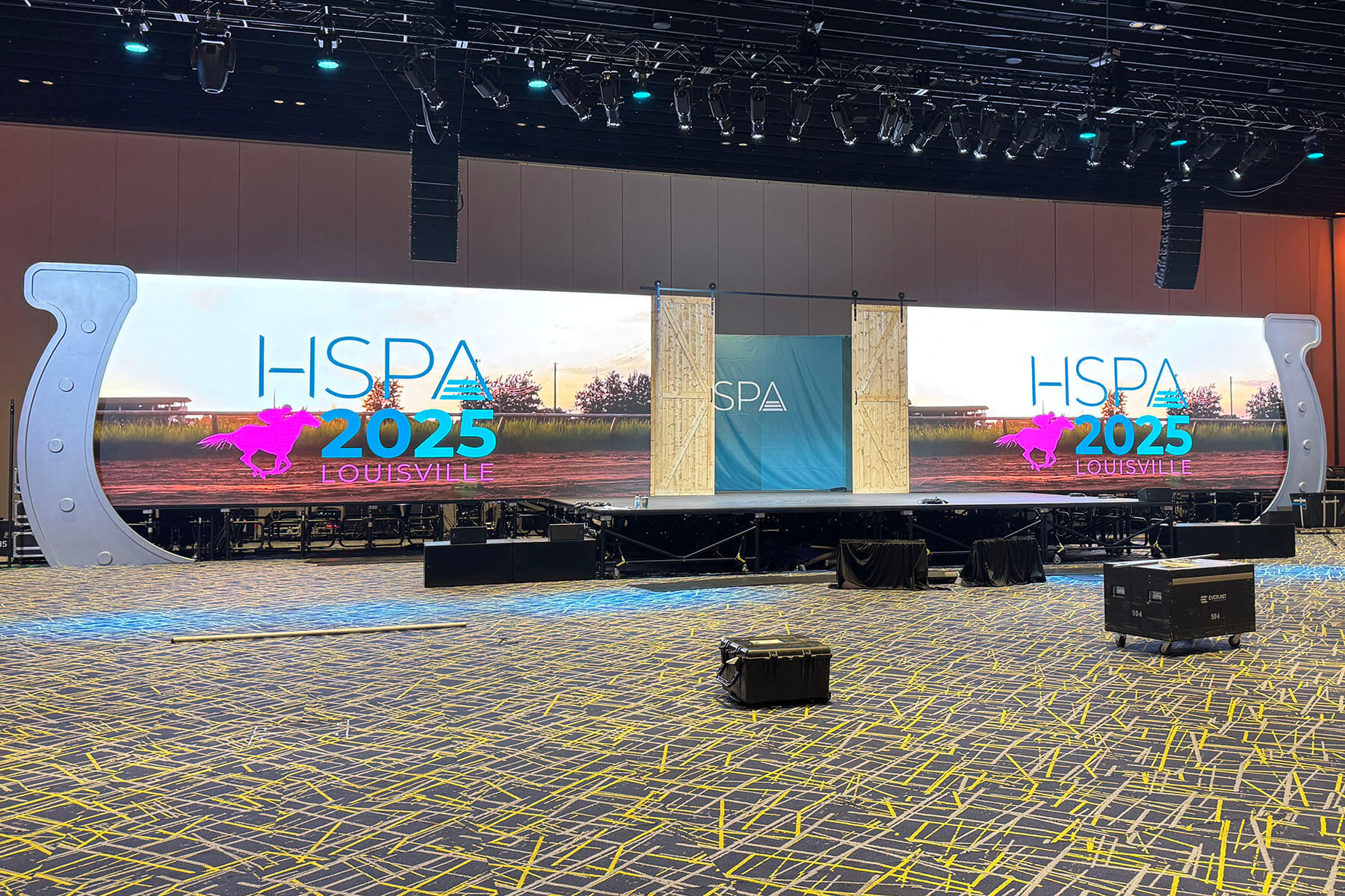 Infinity Productions was hired by Everlast Productions to design and fabricate scenic elements for the HSPA Convention at KICC in 2026. The project focused on creating bold, Kentucky-inspired visual moments that enhanced both the lobby experience and the main stage environment.