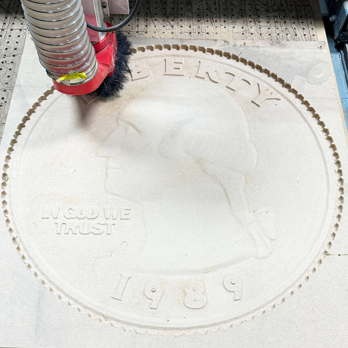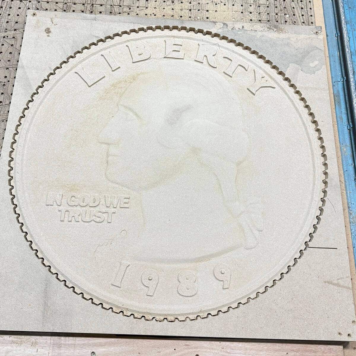 Our journey began with the design and production of the largest quarter, crafted from Medium Density Fiberboard (MDF) using our state-of-the-art CNC router. This meticulous process allowed us to sculpt a detailed and accurate representation of the quarter, ensuring it would stand out as the focal point of the commercial. Once the quarter was sculpted, our lead scenic artist applied a faux finishing technique to give it a realistic appearance, transforming it into a stunning visual centerpiece that captured the essence of the Kentucky Lottery theme.