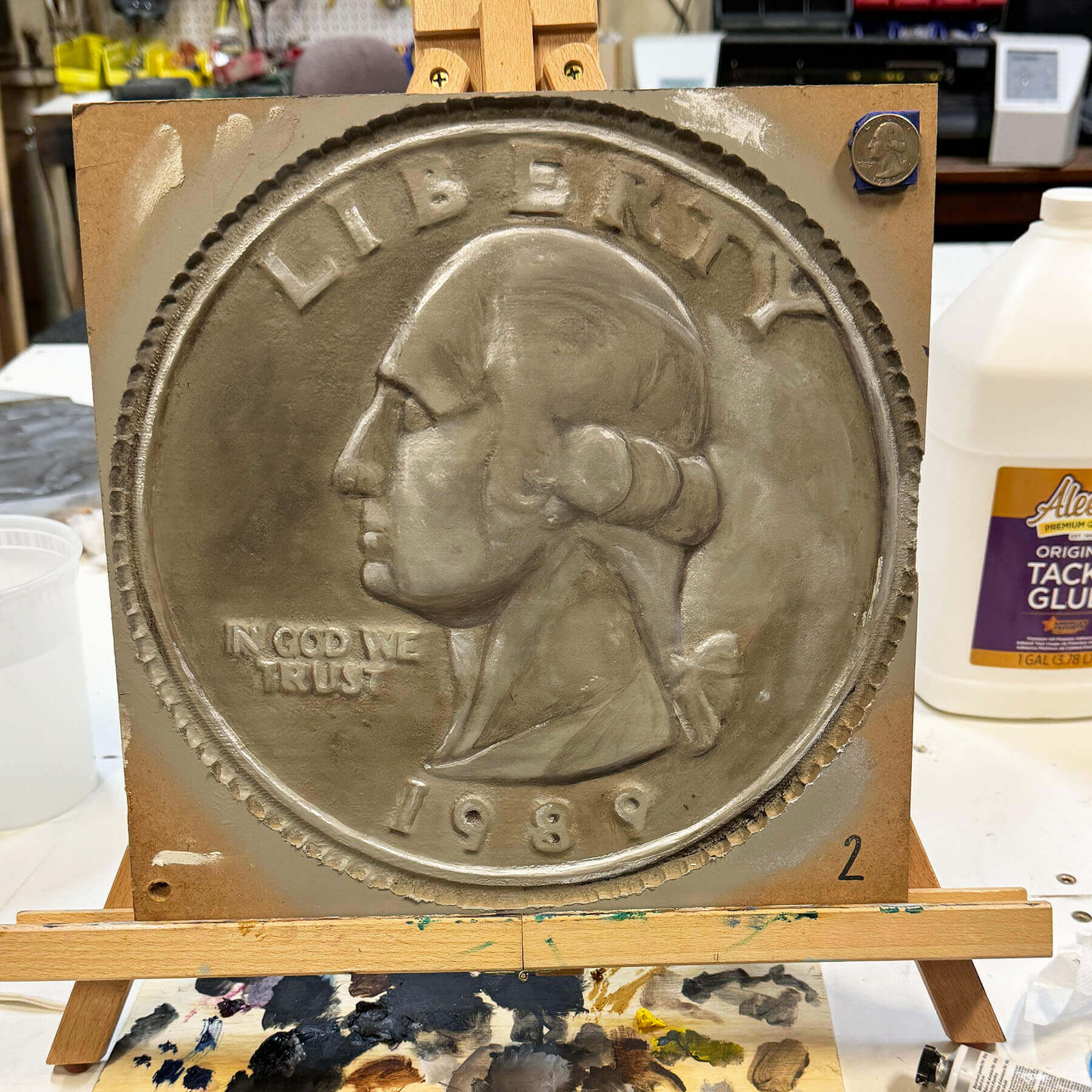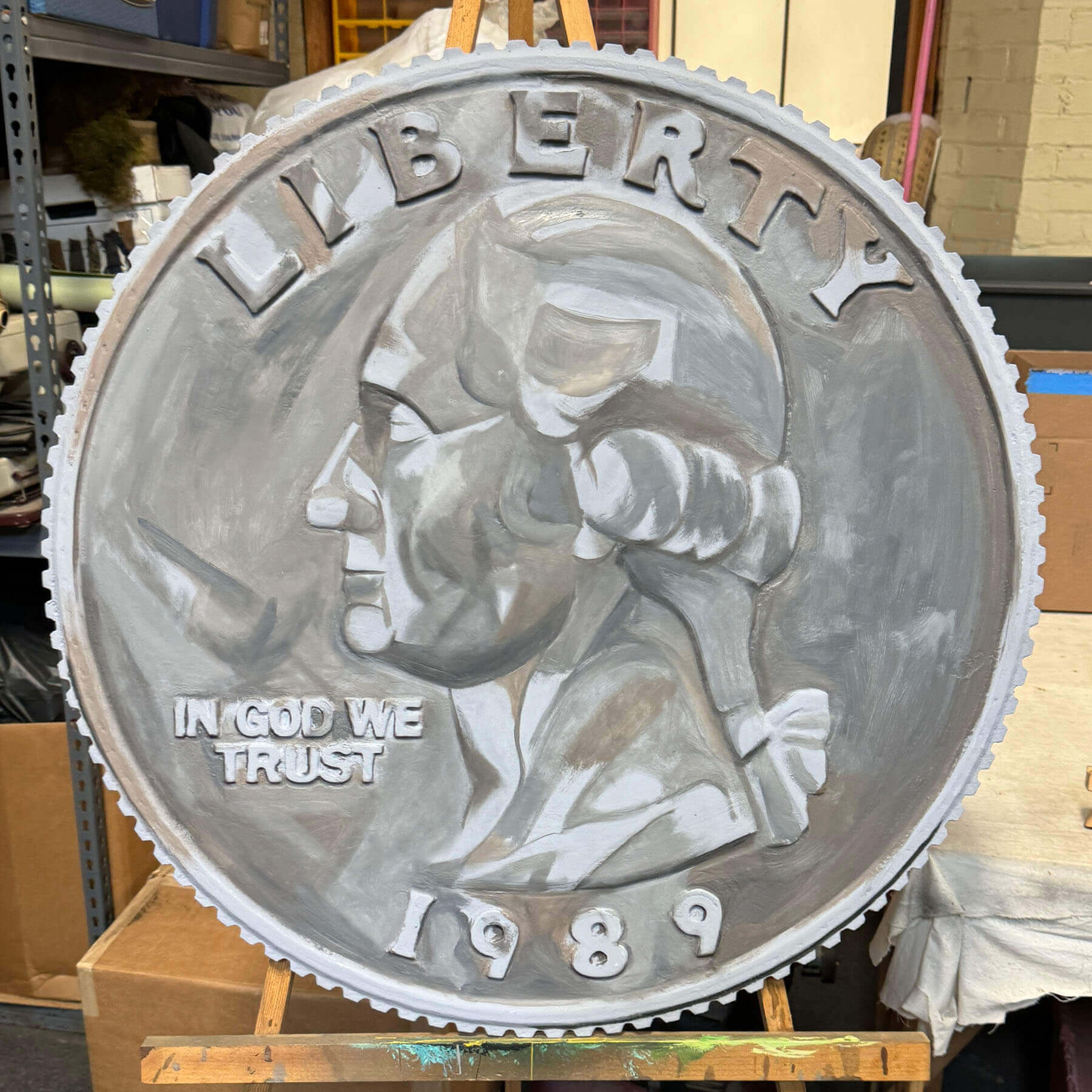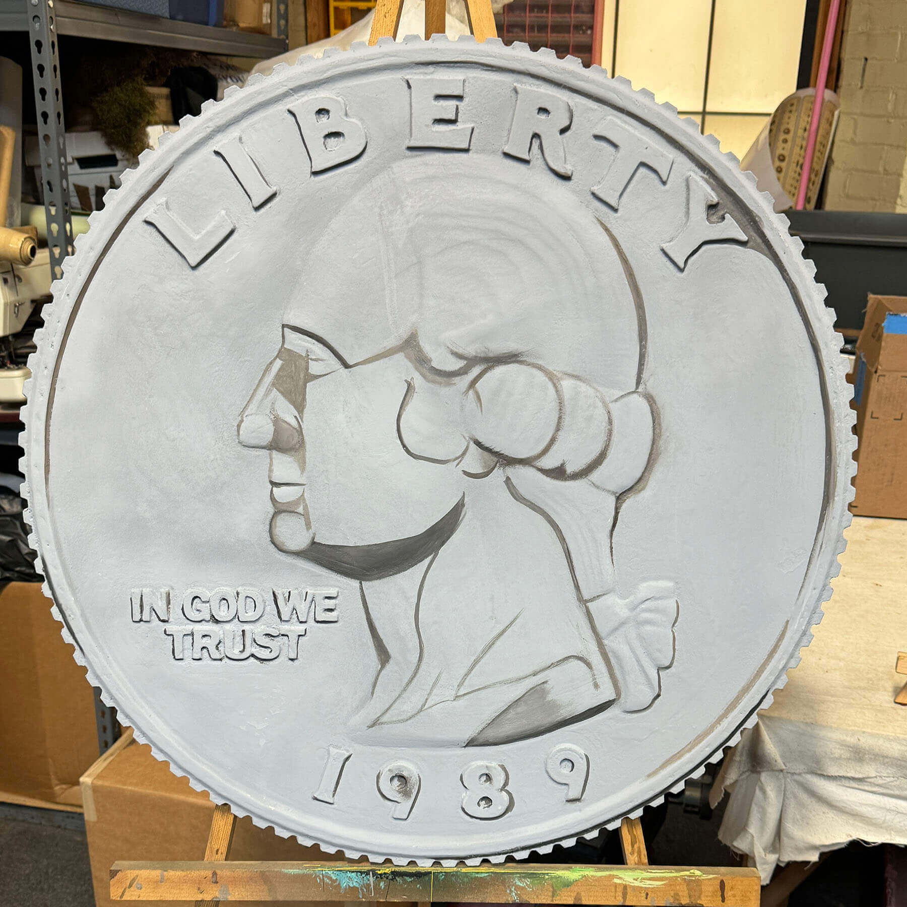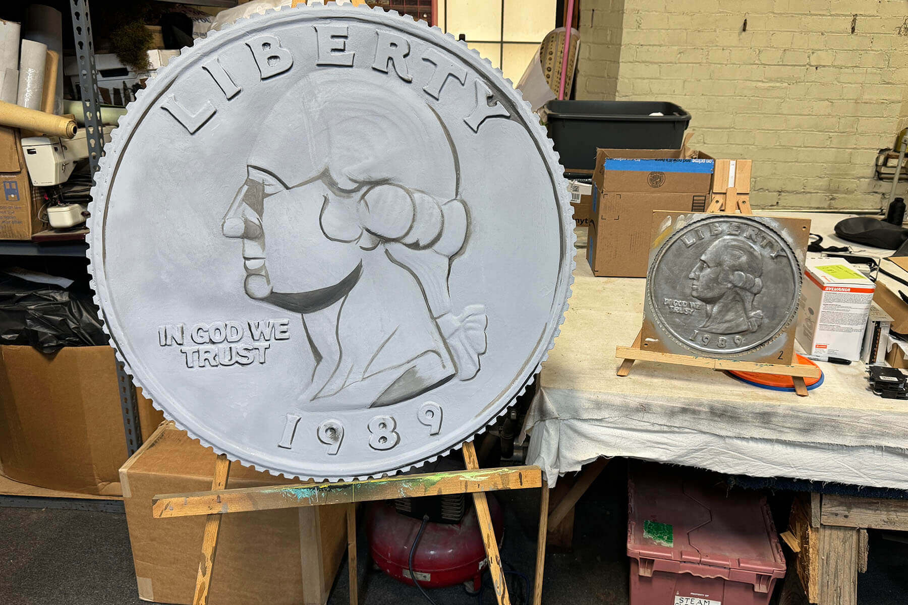 The application of faux finishes added a layer of realism to the oversized quarter, making it visually appealing and in line with the commercial’s theme.