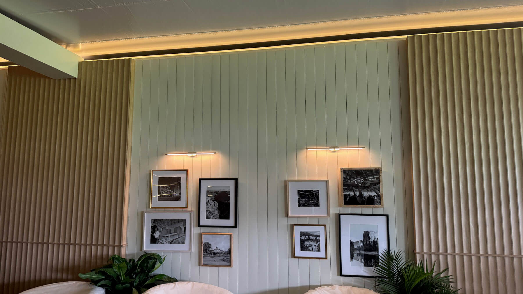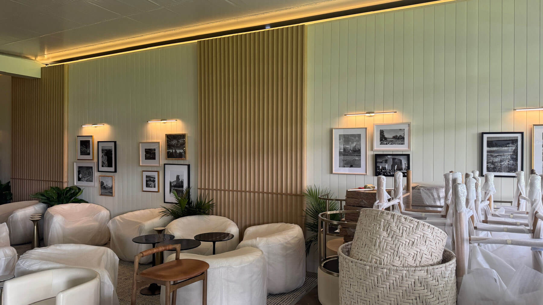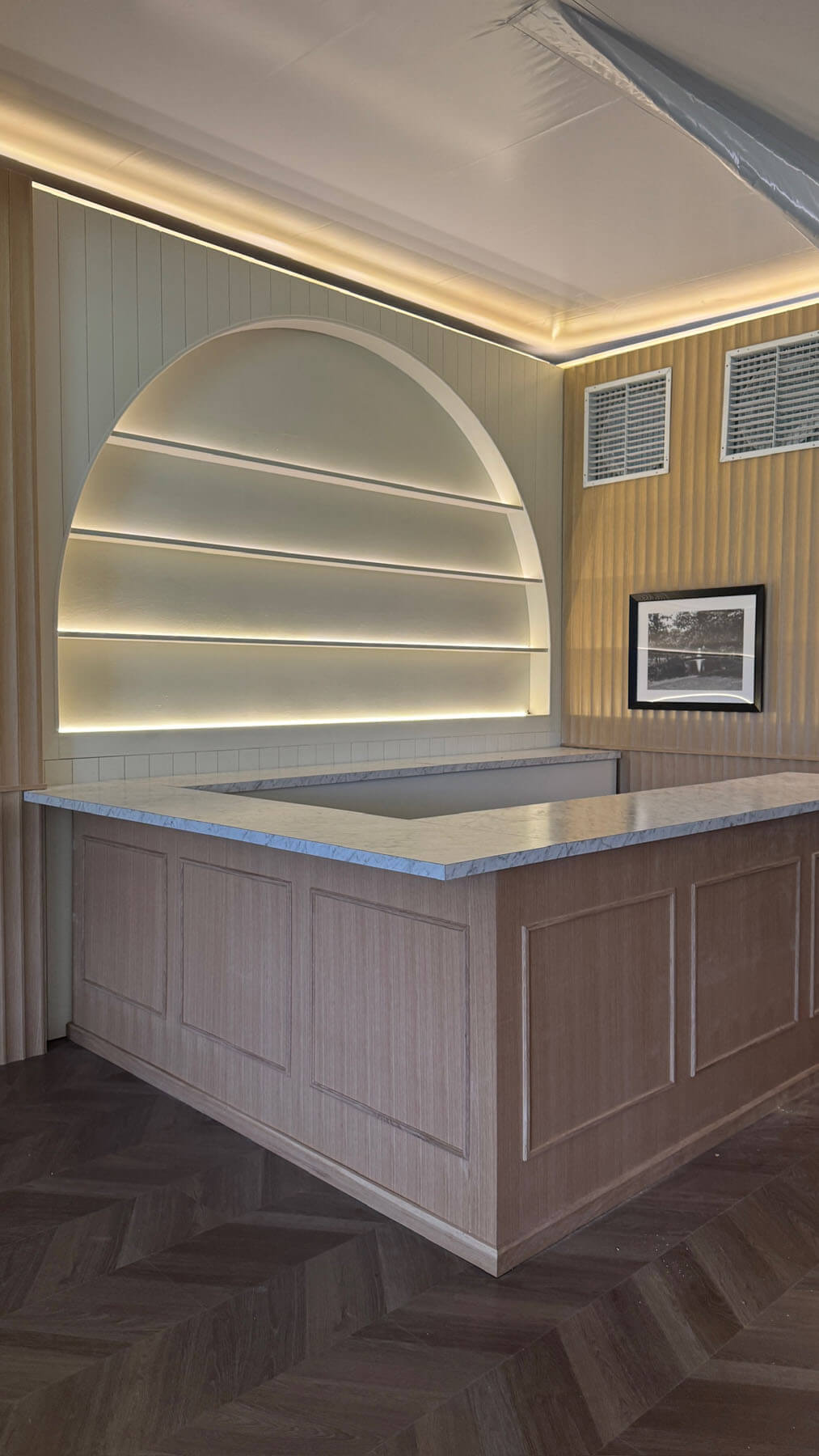 To create a fully immersive environment, custom flats were constructed and installed, framing the room in tranquil and sophisticated nickel board walls and laminate white oak fluted paneling.