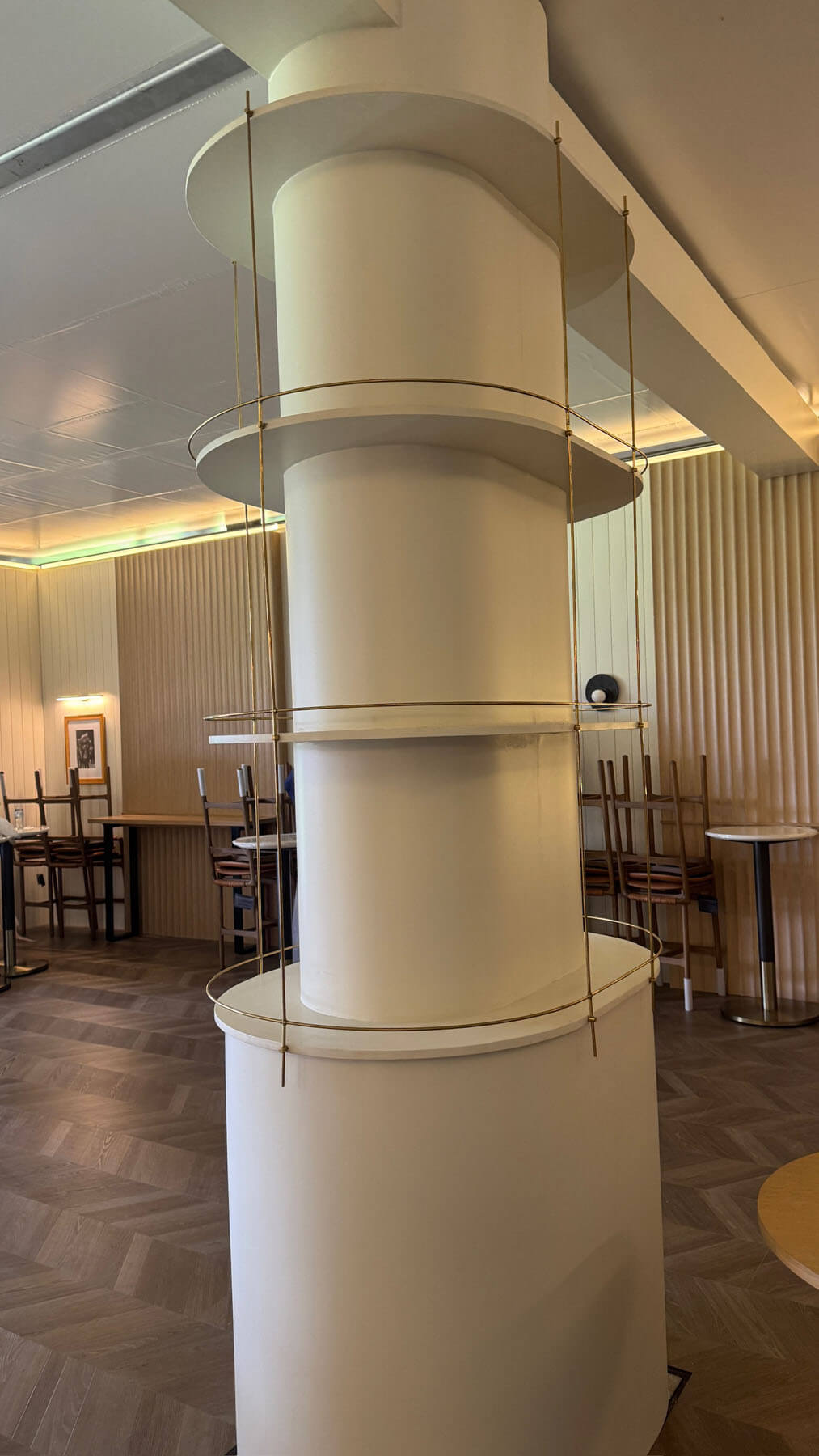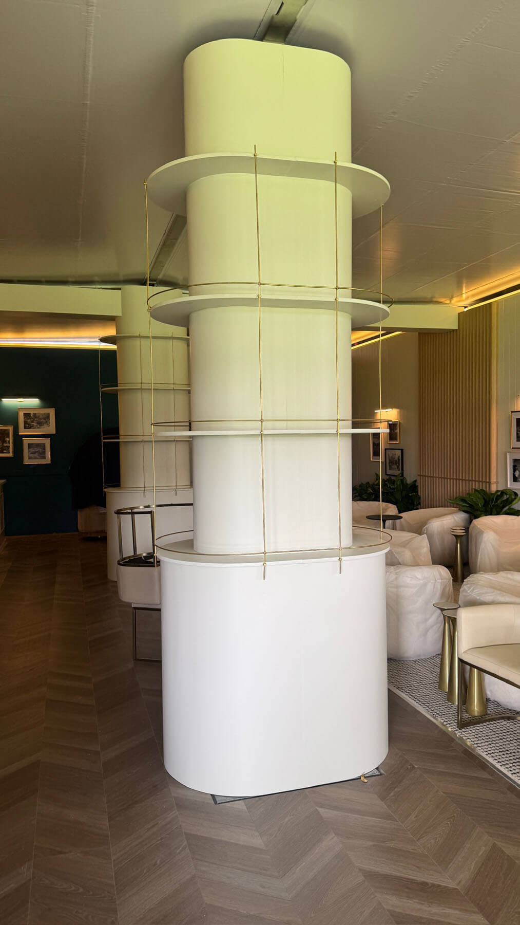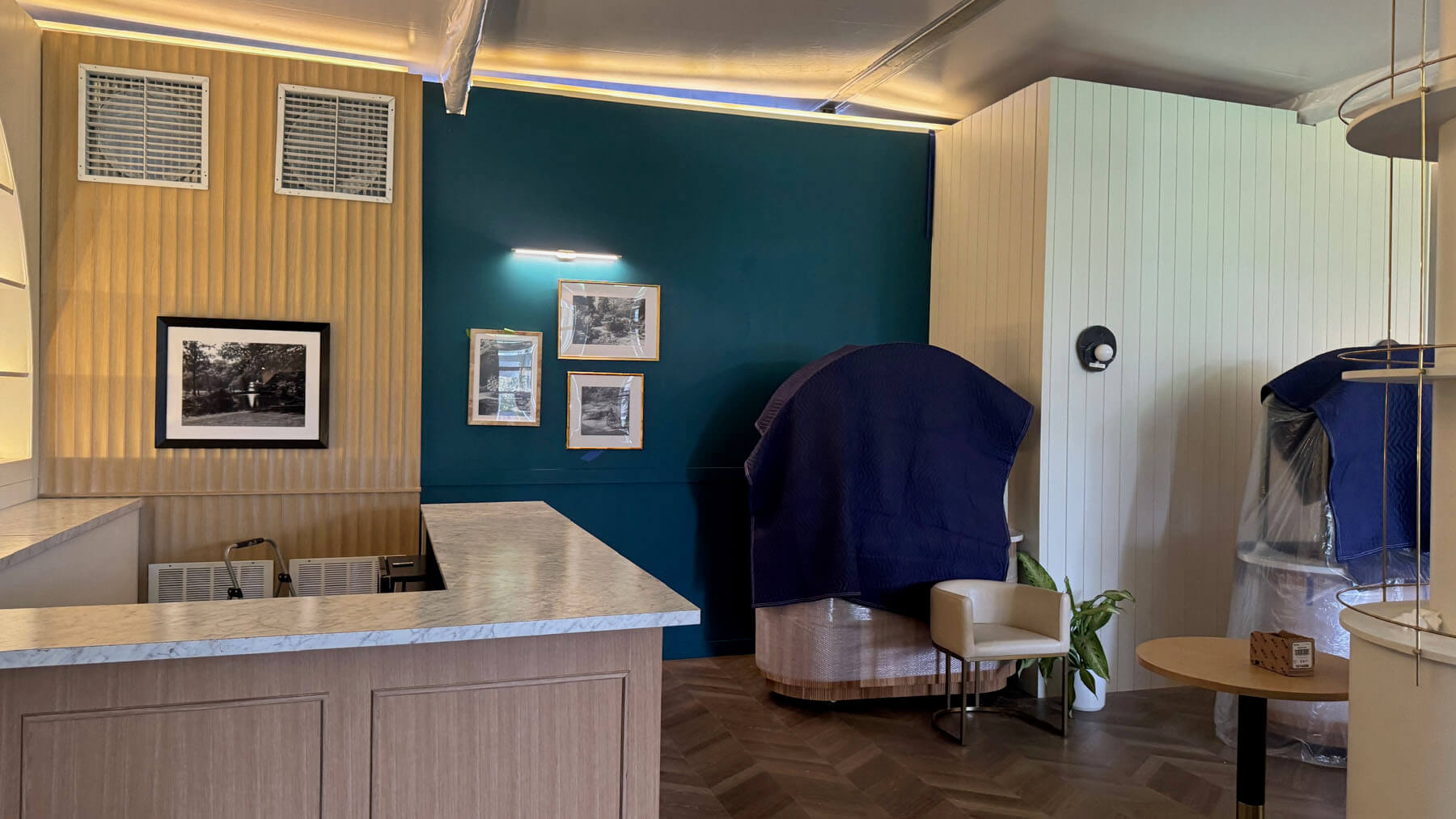 To create a fully immersive environment, custom flats were constructed and installed, framing the room in tranquil and sophisticated nickel board walls and laminate white oak fluted paneling.