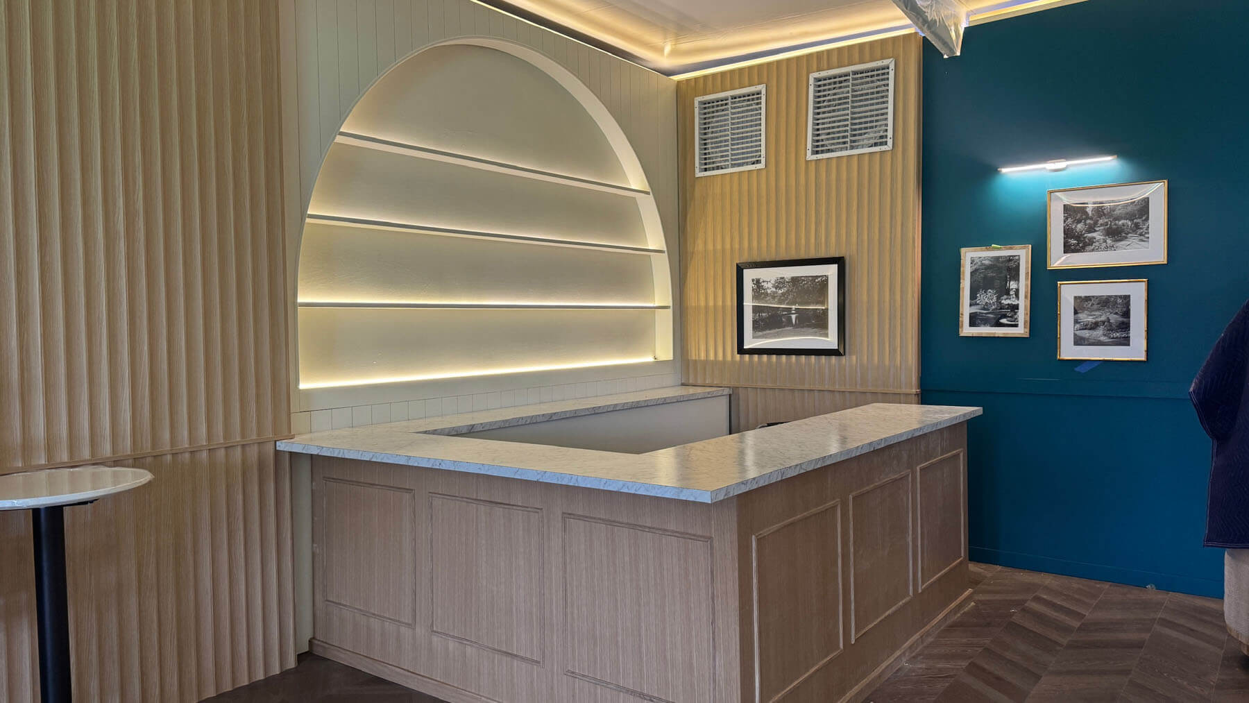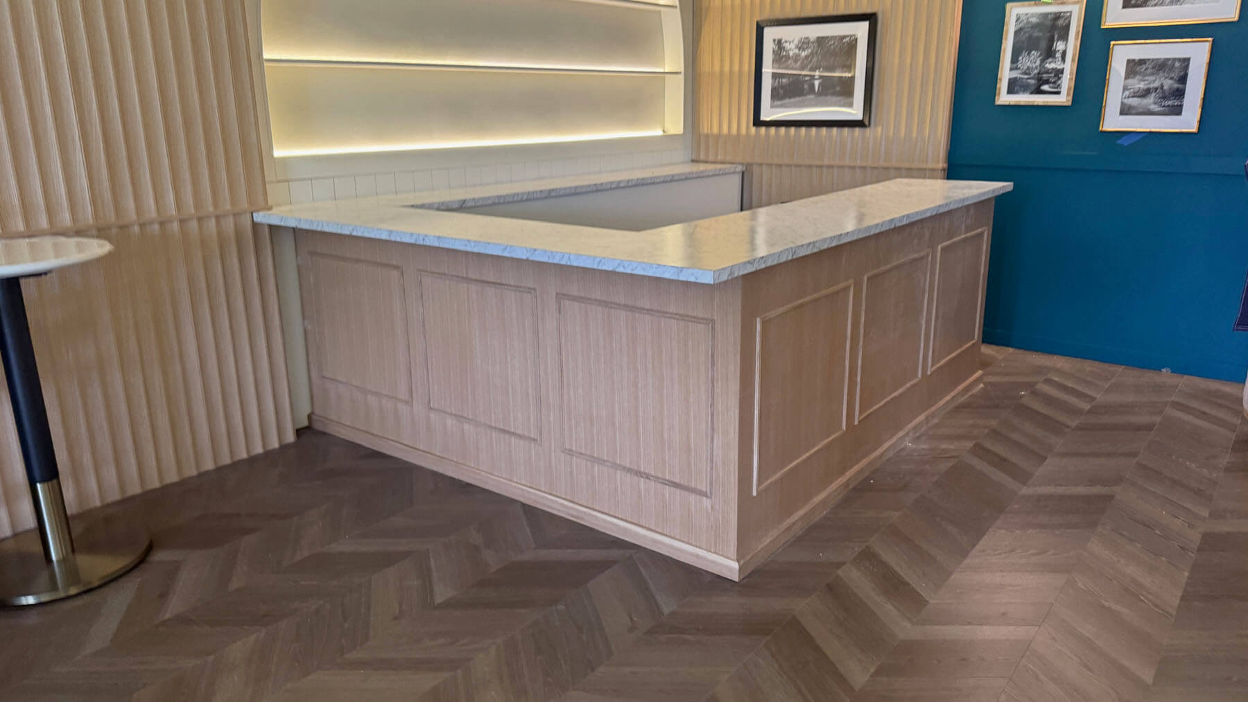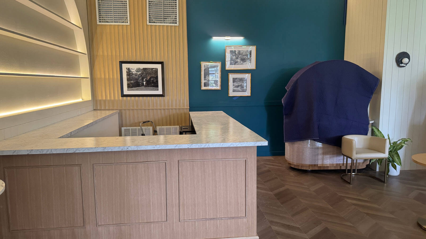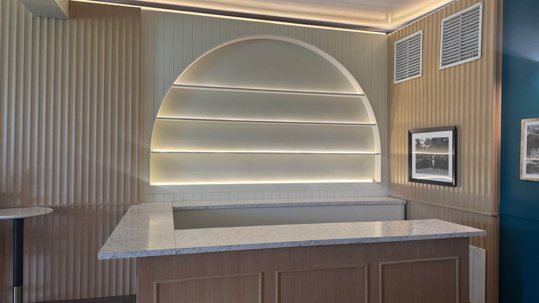 Additionally, a contemporary bar was designed and installed, including a back bar, chic floating shelves, and tasteful mirror. Columns featuring brass trim and floating shelves were also fabricated and positioned in the middle of the suite, adding a natural visual division between the lounge area and bar. Cove lighting recesses were fabricated, and LED lighting was installed along the ceiling of the Patina Suite. This hidden lighting softly illuminated the room, creating a relaxing ambience for guests.