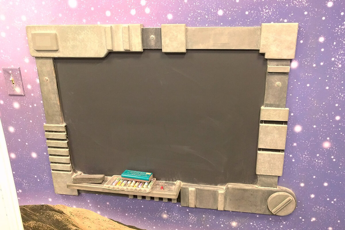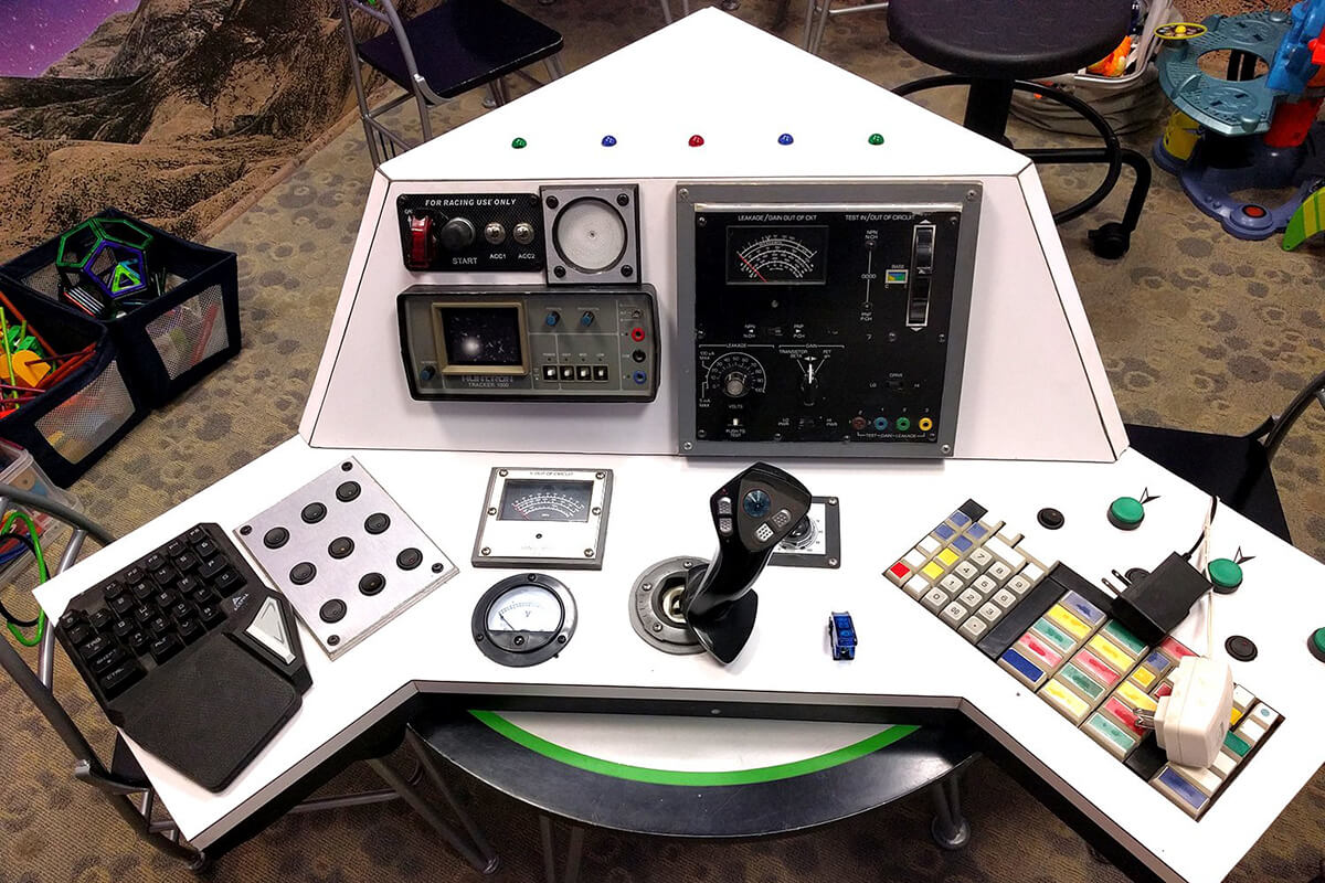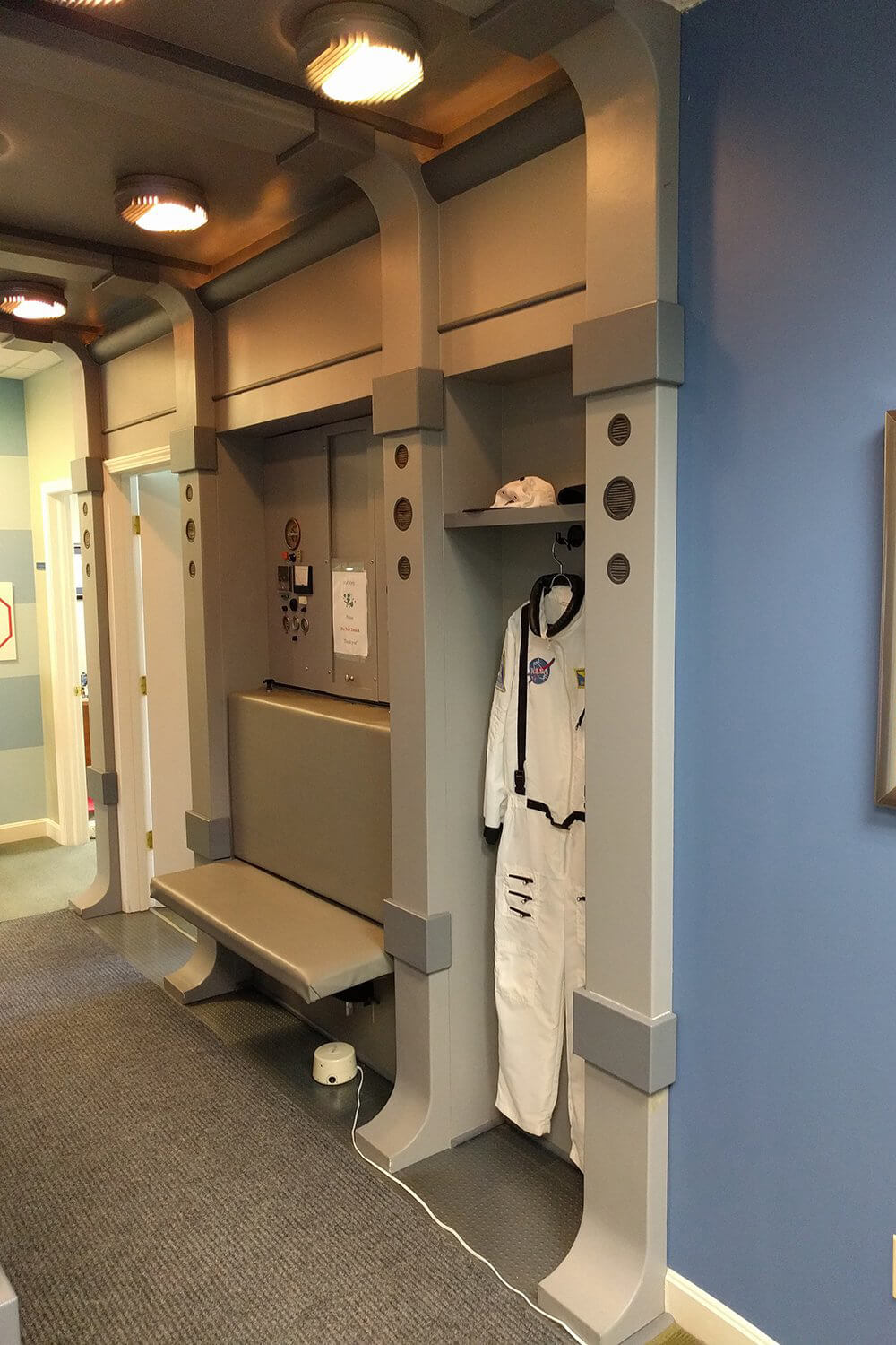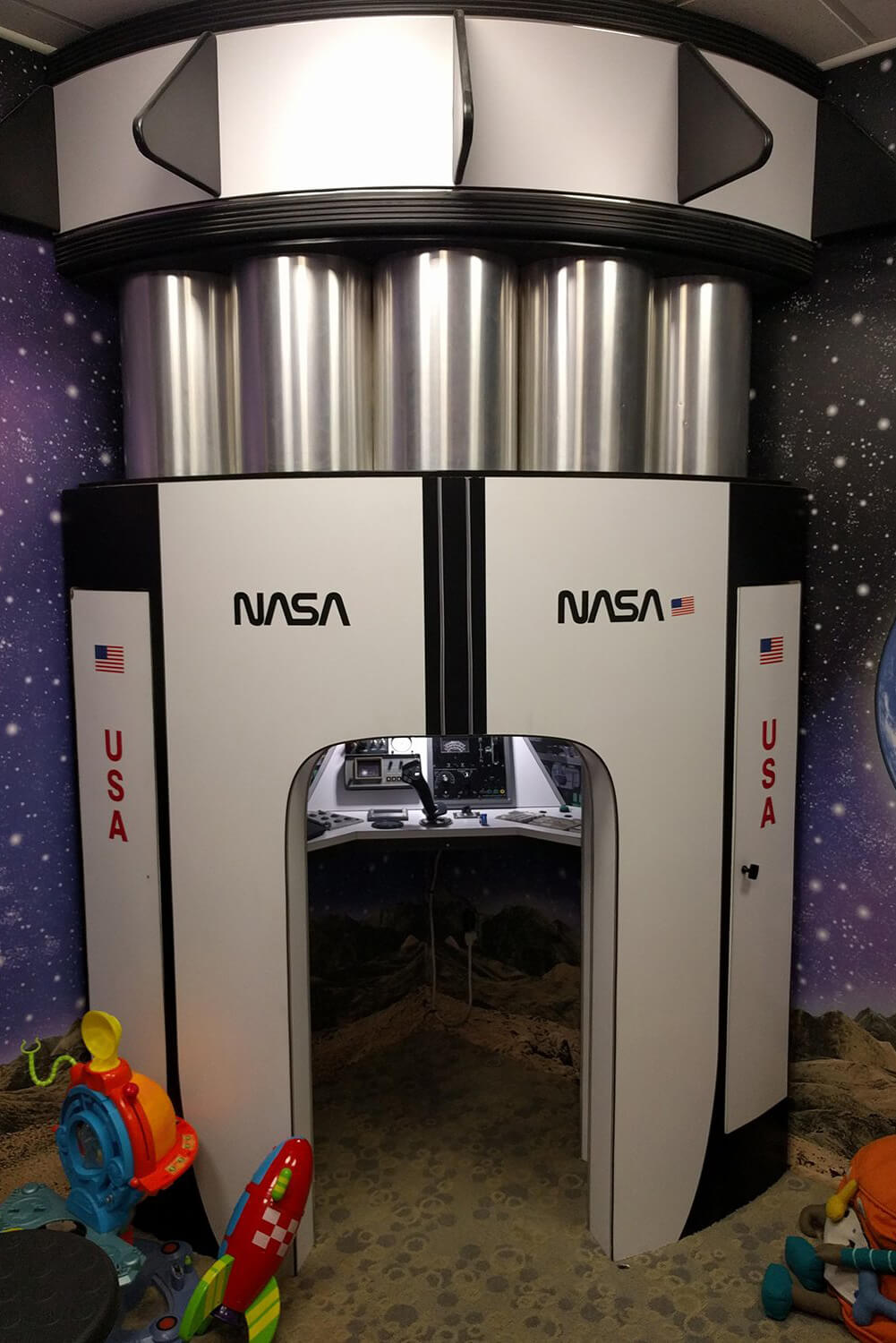 Kids enter the Space Room through an interactive bulkhead hallway that features a pneumatically controlled bench that swings out at the push of a button and a one-way mirror that allows nervous parents or social works to observe the child patients. As they enter into the immersive therapy room filled with interactive consoles and gadgets, a chalkboard “screen” acts as a communication and drawing space for the kids and the NASA rocket ship helps them to relax as they engage with the therapist.
