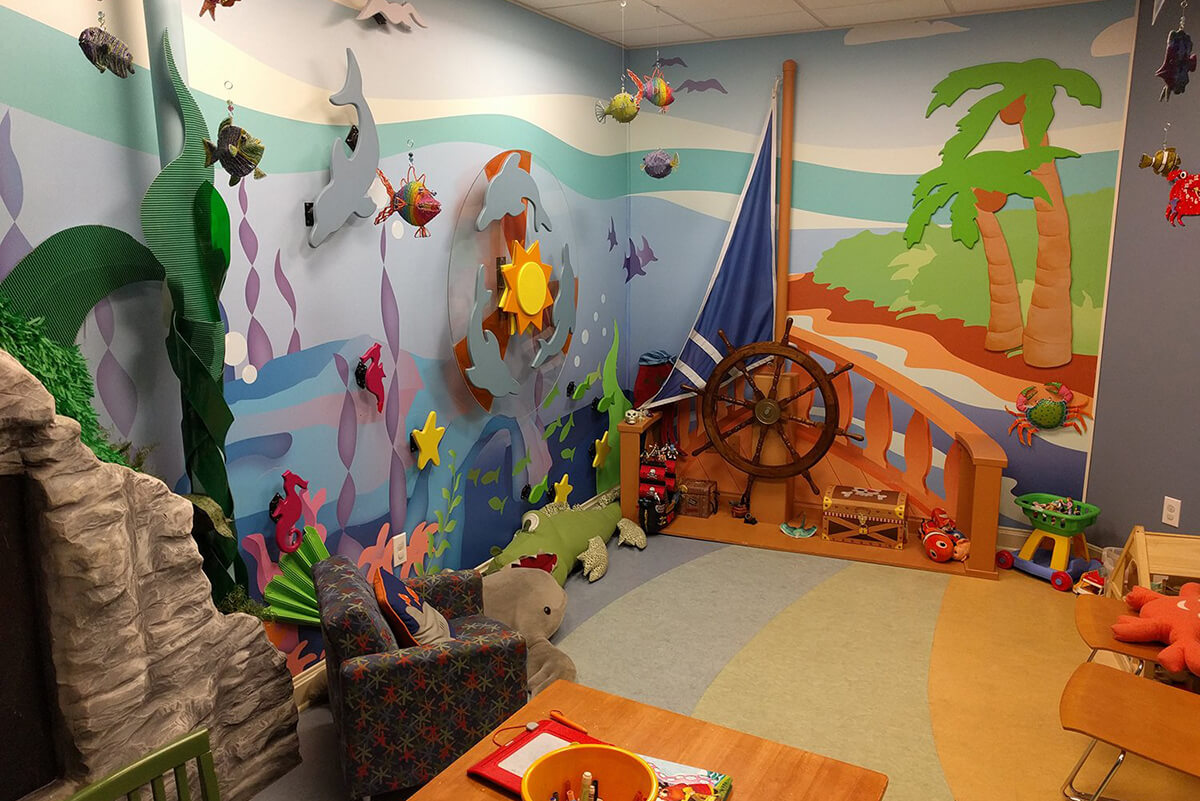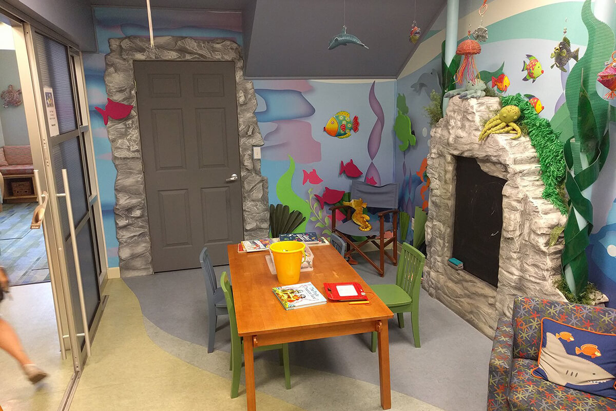 The Under the Sea waiting room has several interactive components like a pirate ship’s wheel, a spinning circular pod of dolphins, toys, boxes and grottos.